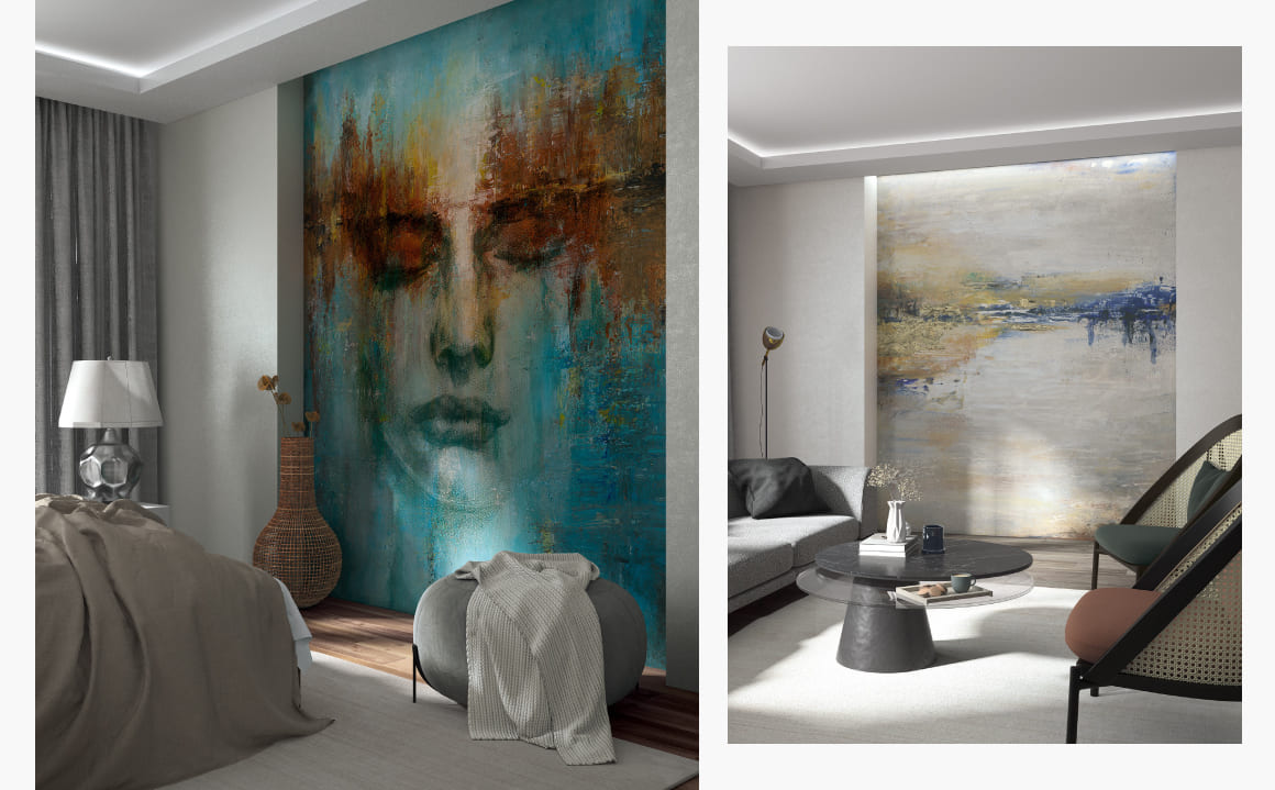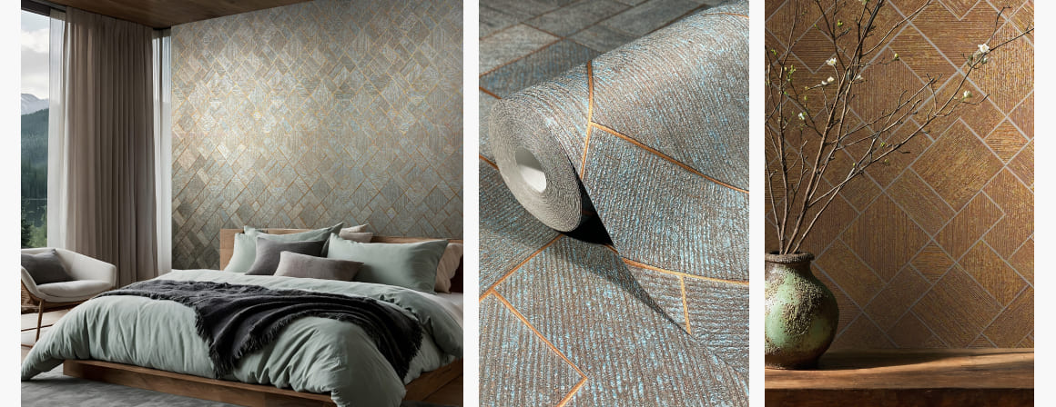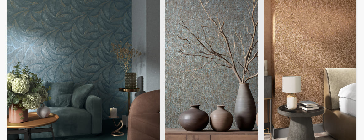 Expressive digital prints and a variety of textured surfaces add depth and character to each design. The wallpaper surface features subtle textures with delicate metallic accents, adding dimension and visual interest to the wall. These designs work well with a variety of interior styles, including modern, loft, or spaces that aim for a distinctive and stylish atmosphere.