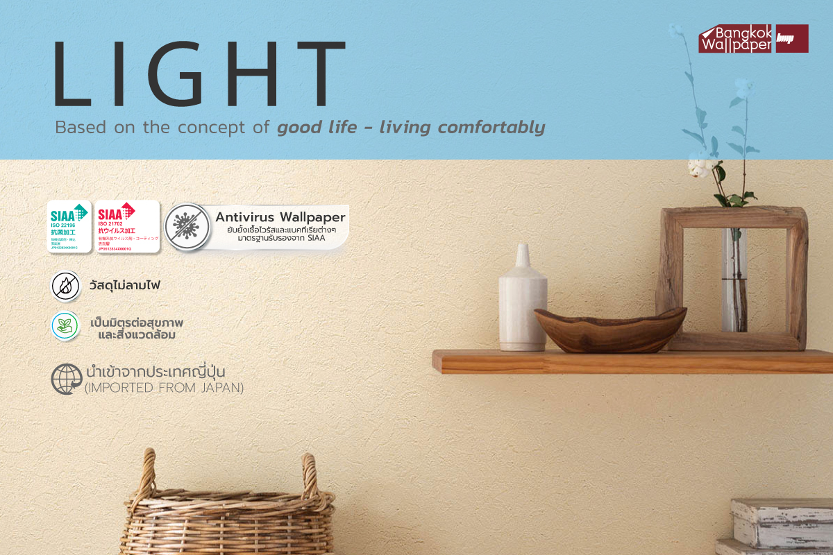 The outstanding health feature of the Light collection wallcoverings is anti-virus, there is a coating layer on the wallpaper surface that helps reduce the number of virus and anti-bacterial. Moreover, Light collection help prevents bacteria from adhering to the wallpaper, reduce bad ador, Safe for residents' health and has been certified by SIAA (Society of Industrial Technology for Antimicrobial Articles) under ISO 21702* and ISO 22196*