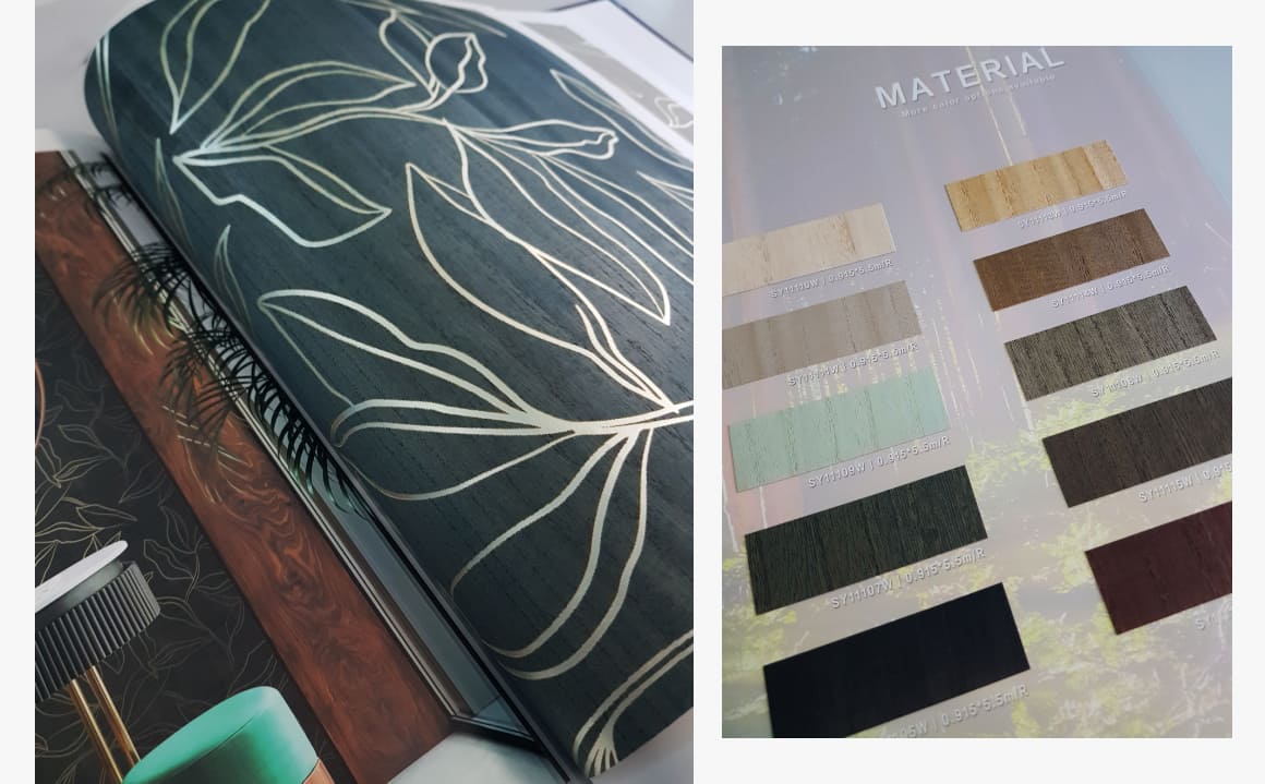 สำหรับวอลเปเปอร์ Woodskin ใช้ไม้เวเนียร์แท้ ทำให้ได้ลายและสีสันของไม้ธรรมชาติไว้ครบถ้วนสมบูรณ์ พร้อมเพิ่มเอกลักษณ์ด้วยลายเส้นเมทัลลิกที่ช่วยให้ผนังดูมีมิติและสวยงามยิ่งกว่าเดิม